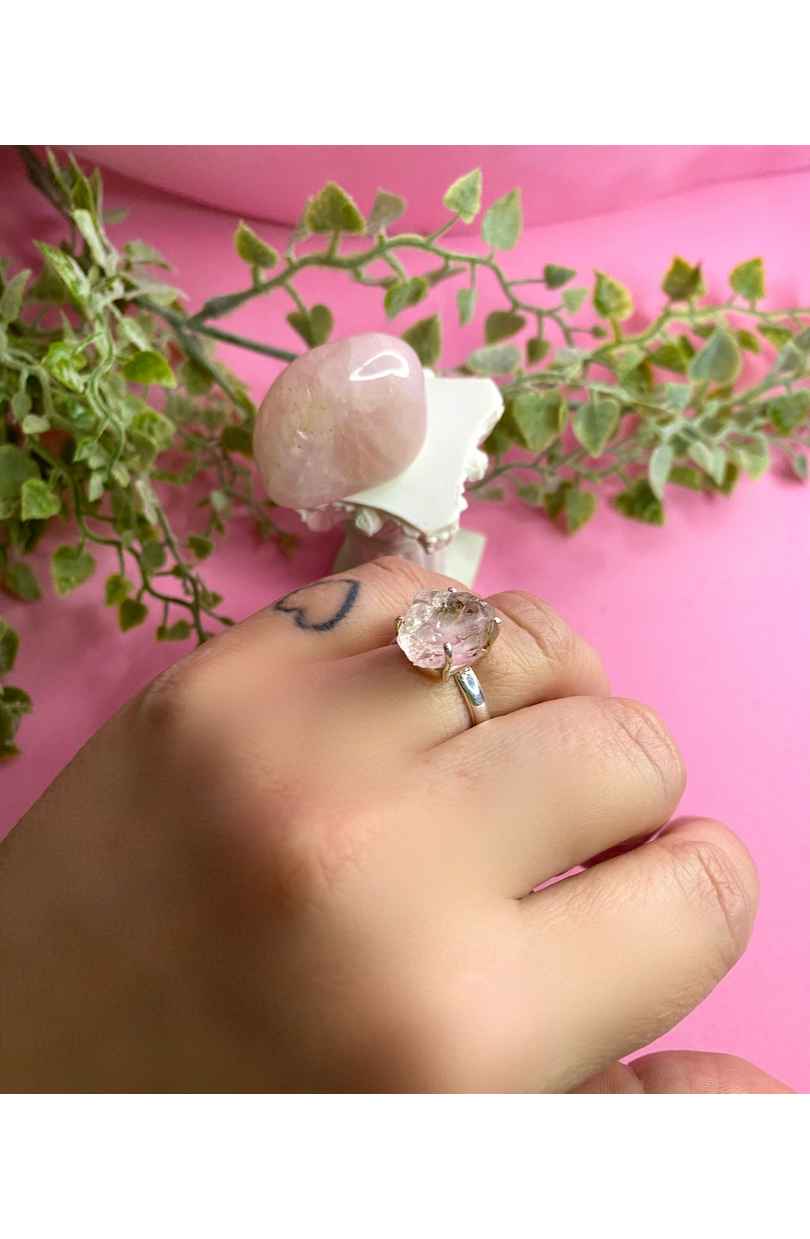Anillo piedra natural cuarzo rosa en bruto, realizado en base de latón con baño de plata 925.