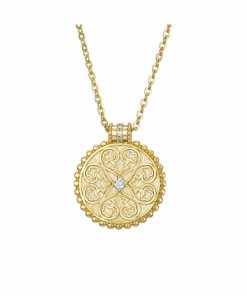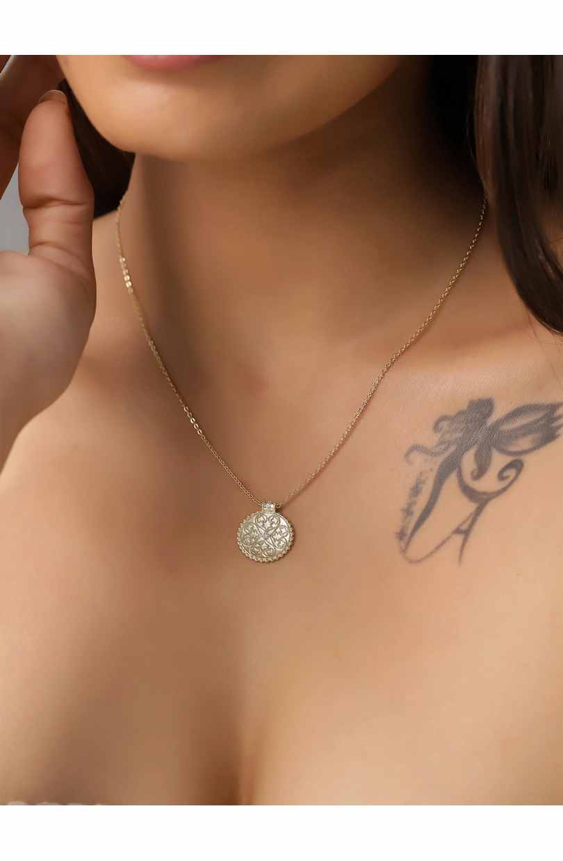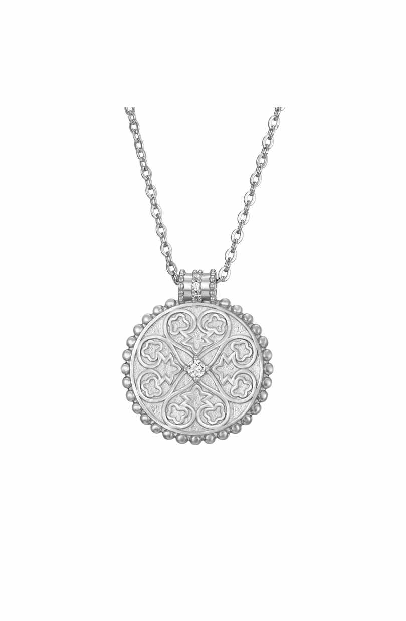 Collar con colgante de mandala con circonitas realizado en plata de ley 925 disponible en acabado bañado en oro y plata rodiada.