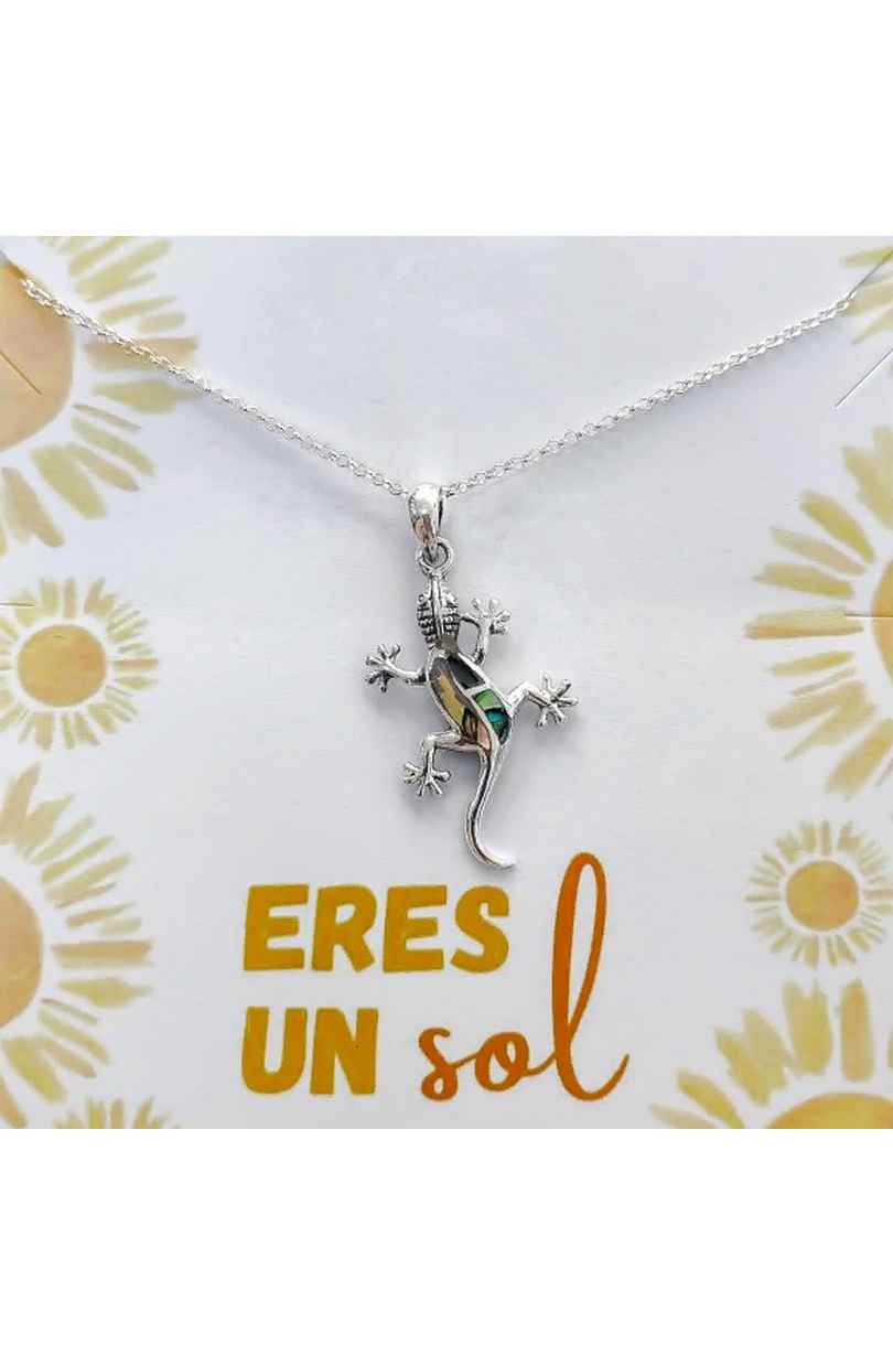 Gargantilla Salamandra realizada en Plata de ley 925 con cadena rolo de 42 cm de largo y cadena adaptable de 3 cm con motivo salamandra de 29mm largo, en abulón o nácar blanco.