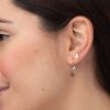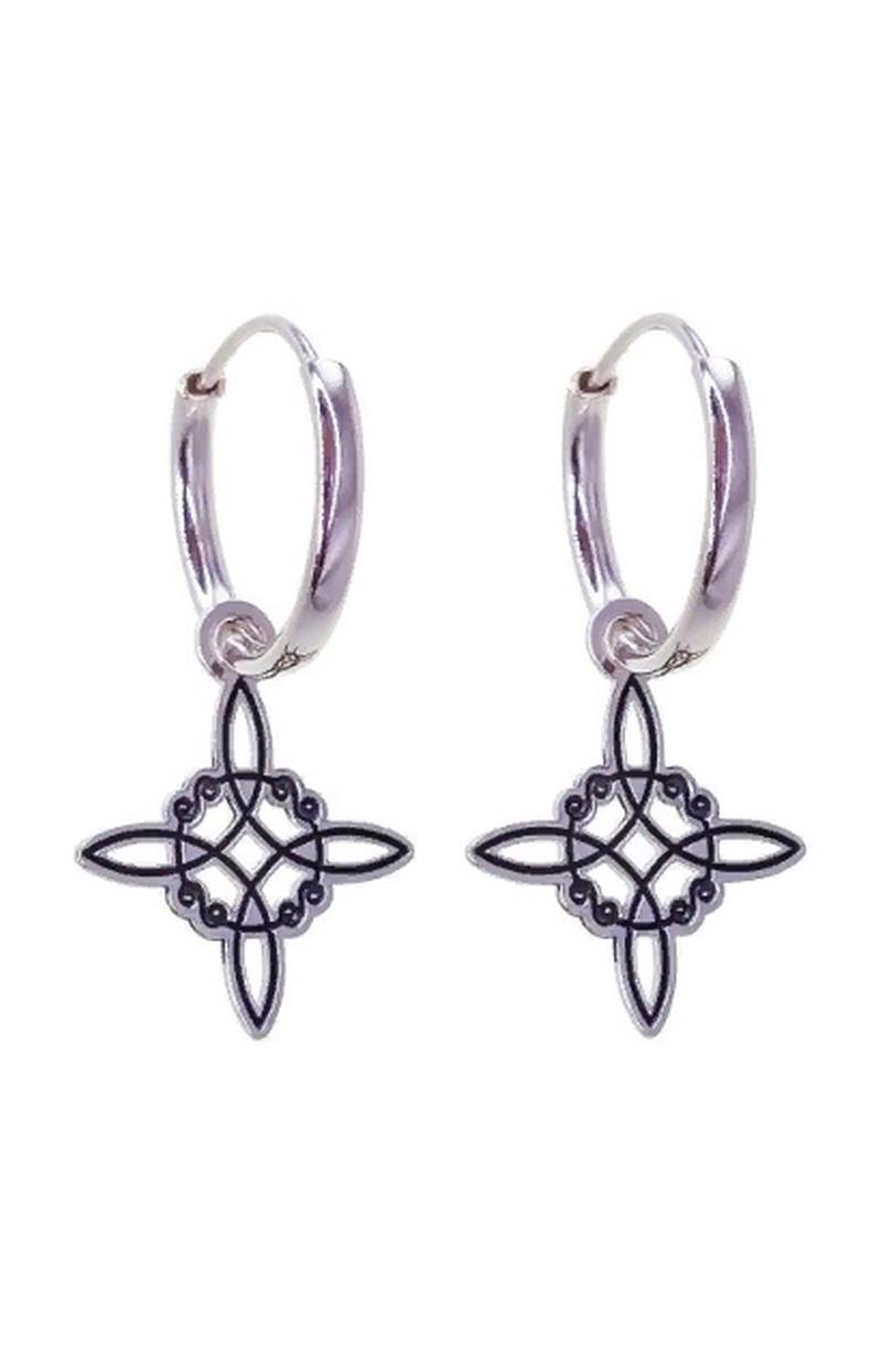 Pendientes realizados en Plata de Ley con aro plata de ley 925 de 12mm diámetro interior con motivo amuleto y nudo de Bruja de 15mm oxidado colgando.