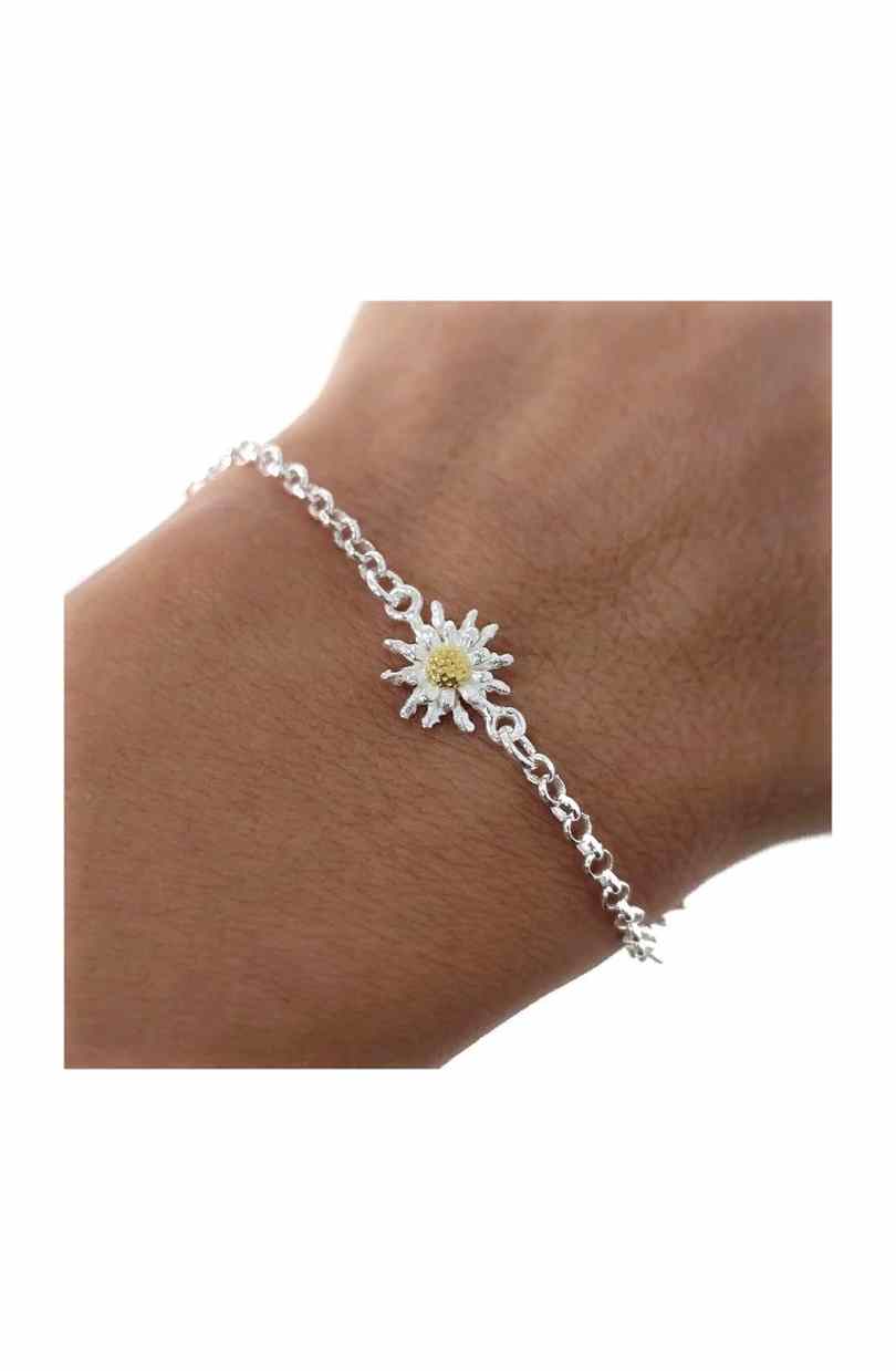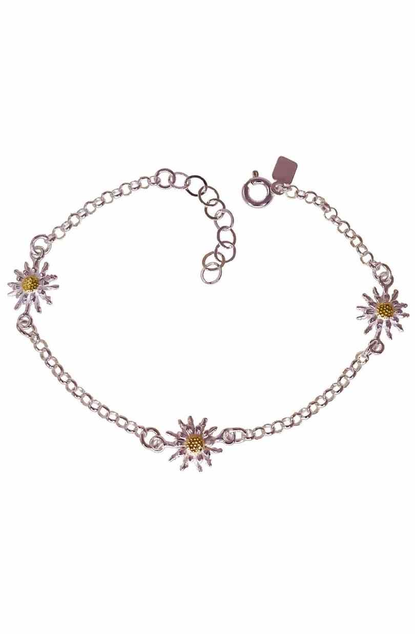 Pulsera flor seca (Pulsera Eguzkilore) realizada en Plata de ley 925 con cadena rolo de 16.5 cm largo + cadena adaptable de 3 cm Flor de 10mm. bicolor.