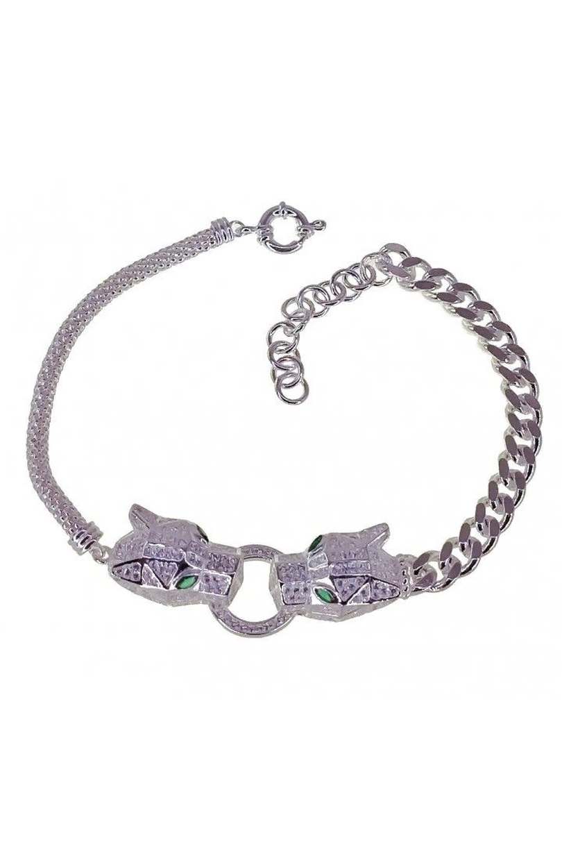 Pulsera realizada en plata de ley 925 rodiada con cadena coreana combinada con cadena barbada ( 17 cm largo + cadena adaptable de 2.5 cm ) motivo Pantera piedras circonitas ( 15mm x 11 mm ). Precio unitario.