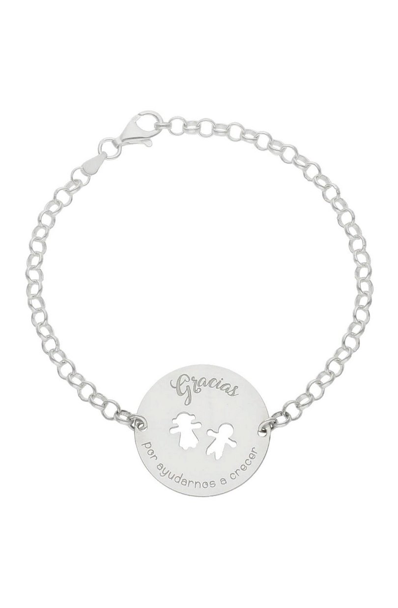 Pulsera realizada en Plata de Ley 925 con cadena rolot de 4mmm de ancho y largo de 19cm, motivo profesores con placa redonda de 25mm con niña y niño troquelados y con frase: GRACIAS POR AYUDARNOS A CRECER o cualquier otra indicada.