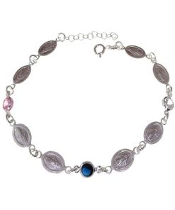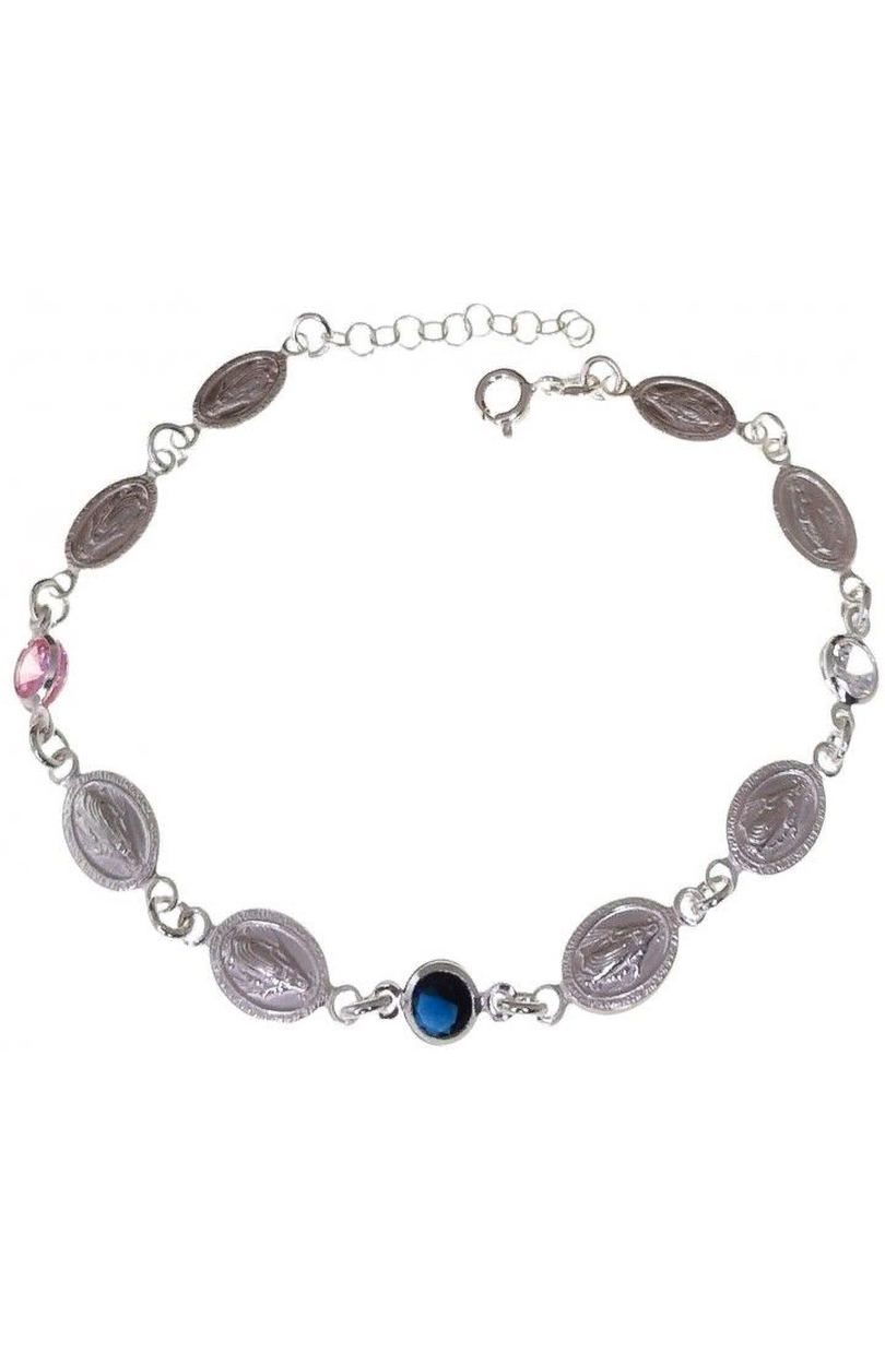 Pulsera realizada en Plata de ley 925, pulsera medallas con piedras circonita rosa, blanco y azul.